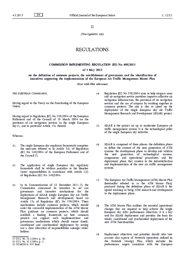 This Regulation defines common projects, referred to in Article 15a of Regulation (EC) No 550/2004, explains how they shall be governed and identifies incentives for their deployment.