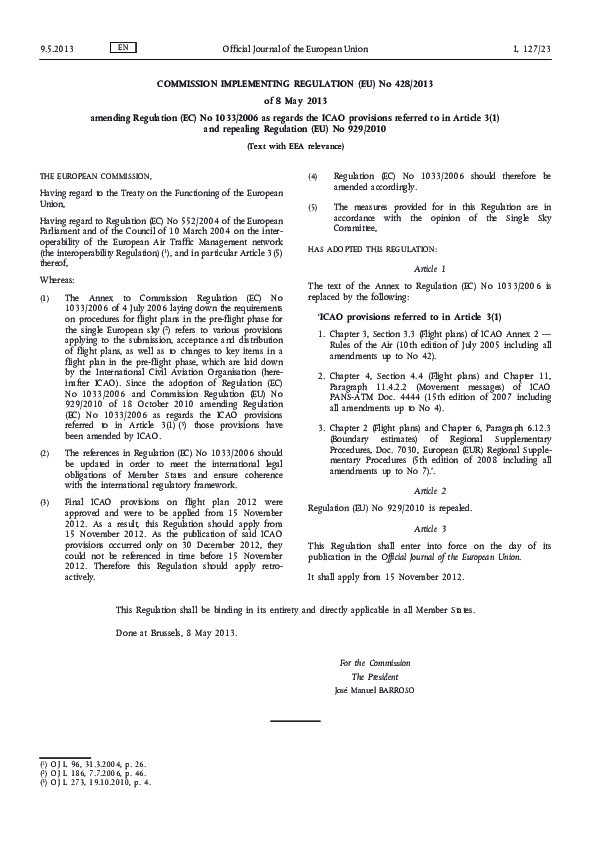This Regulation updates the references to ICAO provisions in Regulation 1033/2006 regarding the submission, acceptance and distribution of flight plans, as well as to changes to key items in a flight plan in the pre-flight phase. This Regulation repeals Regulation 929/2010.