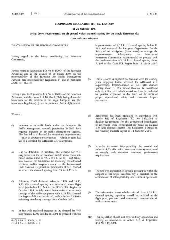 Commission Regulation (EC) No 1265/2007 of 26 October 2007 laying down requirements on air-ground vo