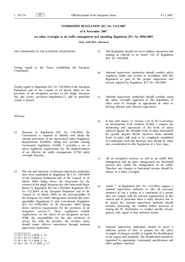 Commission Regulation (EC) No 1315/2007 of 8 November 2007 on safety oversight in air traffic manage