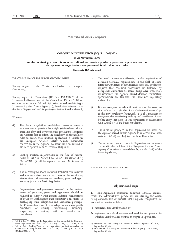 COMMISSION REGULATION (EC) No 2042/2003 of 20 November 2003 on the continuing airworthiness of aircr