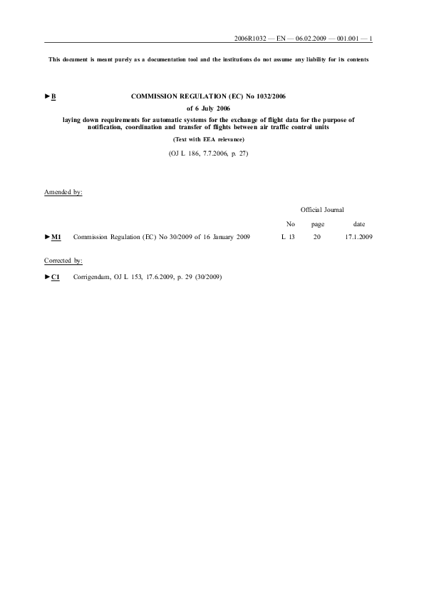 COMMISSION REGULATION (EC) No 1032/2006 of 6 July 2006 laying down requirements for automatic systems for the exchange of flight data for the purpose of notification, coordination and transfer of flights between air traffic control units