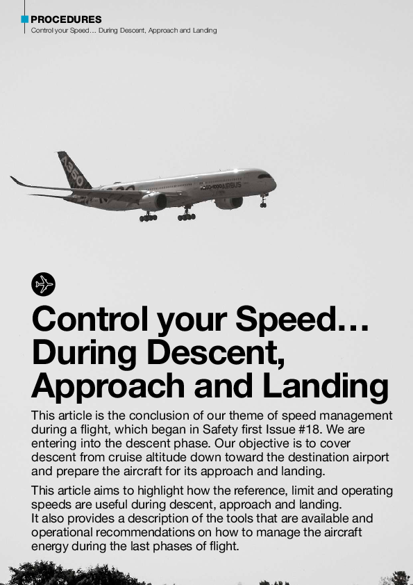 This article aims to highlight how the reference, limit and operating speeds are useful during descent, approach and landing. It also provides a description of the tools that are available and operational recommendations on how to manage the aircraft energy during the last phases of flight.