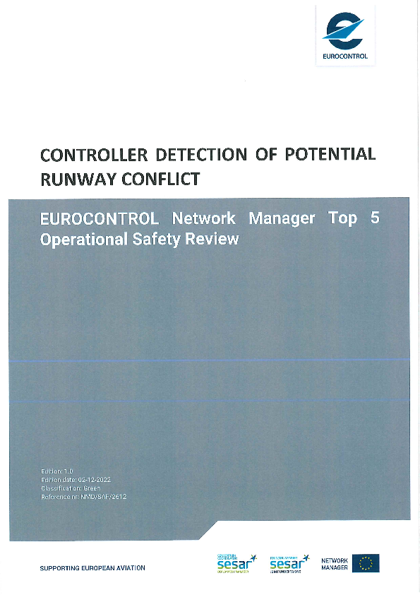 Controller detection of potential RWY conflict was designated as one of the top 5 safety priorities based on the 2022 study of 2021 incident data sample by the Network Manager. The document contains a dedicated study based on 362 Category A and B runway incursions that happened within the period 2013-2021. It evaluates the effectiveness of relevant safety barriers and elaborates on best practices to avoid the reoccurrence of such incidents.