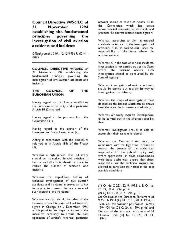 Council Directive 94/56/EC of 21 November 1994 establishing the fundamental principles governing the
