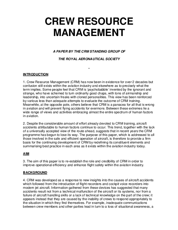 A paper by the CRM Standing Group of the Royal Aeronautical Society which aims to re-establish the role and credibility of CRM in order to improve operational efficiency and enhance flight safety within the aviation ind
