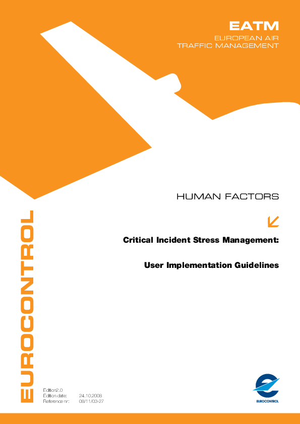 This guideline document facilitates and supports the implementation of a Critical Incident Stress Management (CISM) programme. It proposes the steps to be followed during the whole process through the phases of definition, planning, implementation and supervision of the programme. This document is a revision of an earlier EUROCONTROL publication, Critical Incident Stress Management: User Implementation Guidelines' (2005).