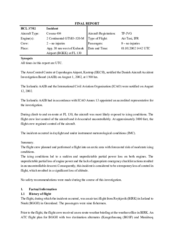 On 1 August 2002, a Cessna 404, enroute at FL130 over Greenland, experienced sudden power loss on both engines, probably as a result of ice in the induction systems, leading to loss of control. The crew regained control at 3000 feet.