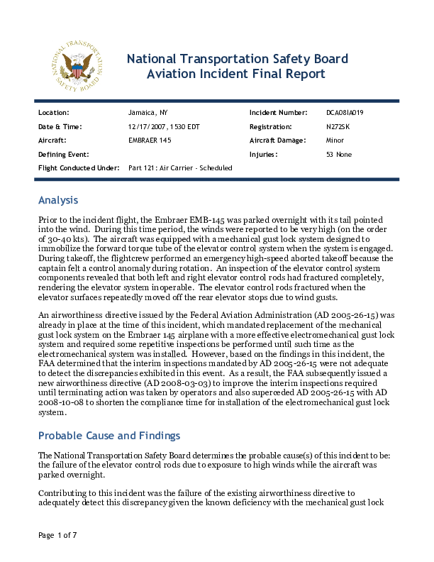 On 17 December 2007, an Embraer 145 being operated by Chautauqua Airlines on a Delta Connection passenger flight departing New York JFK runway 31L for an unrecorded destination carried out a high speed rejected take off in normal day visibility when the response to elevator control input at rotation was abnormal. The aircraft stopped on the runway and was subsequently able to taxy back to the gate where all 50 passengers were disembarked. Aircraft damage to the aircraft was confined to the elevator control system and to sheet metal on the horizontal stabiliser.