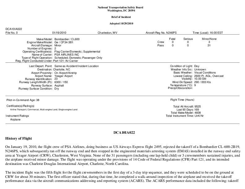On 19 January 2010, a Bombardier CRJ 200 being operated by PSA Airlines on a domestic passenger flight departing Charleston to Charlotte NC carried out a high speed rejected take off in normal day visibility and overran the end of the dry runway 23 into an EMAS installation. The aircraft stopped within the EMAS in line with its design parameters applicable to the aircraft type and suffered only minor damage. None of the 34 occupants were injured.