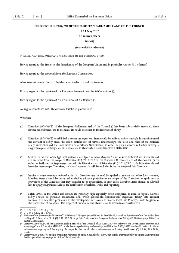 Directive (EU) 2016/798 of the European Parliament and of the Council on Railway Safety