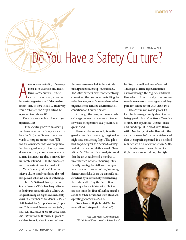 If you believe your organization has a strong safety culture, you are almost certainly mistaken - a safety culture is something to be striven for but is rarely achieved. Some probing questions from the Vice Chairman of the US NTSB