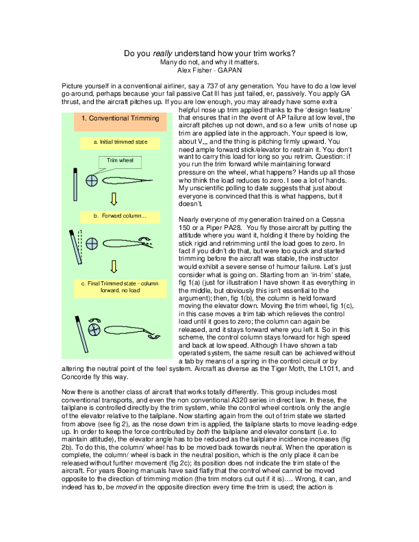 A paper written by Captain Alex Fisher for GAPAN. The paper was presented at the Go-Around Safety Forum (GASF) in Brussels in 2013. The paper focuses on the use of trim in the go-around. All footnote references in this article have been updated and/or amended since submission by the author to enhance their access or relevance