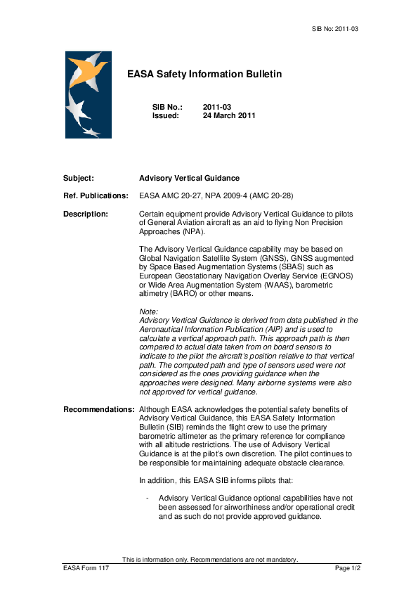 EASA Safety Bulletin 2011-03, 24 March 2011: Advisory Vertical Guidance