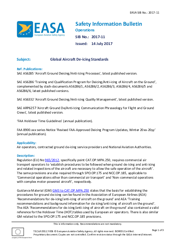 This document contains EASA's recommendations to operators regarding de/anti-icing as well as references to relevant documents.