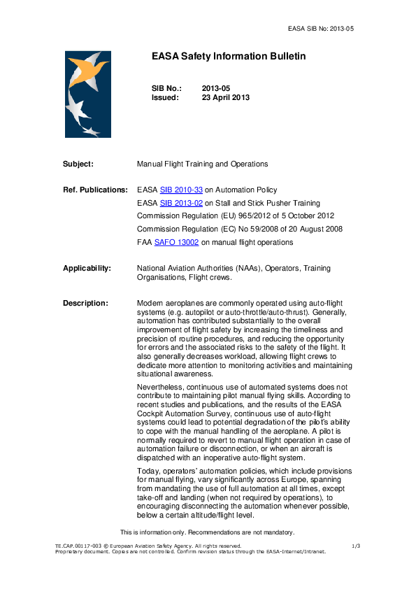This SIB is issued to remind NAAs and operators of the importance of manual flying during recurrent simulator training and also, when appropriate, during flight operations. The overall aim is to reach an appropriate balance between the use of automation and the need to maintain pilot manual flying skills.