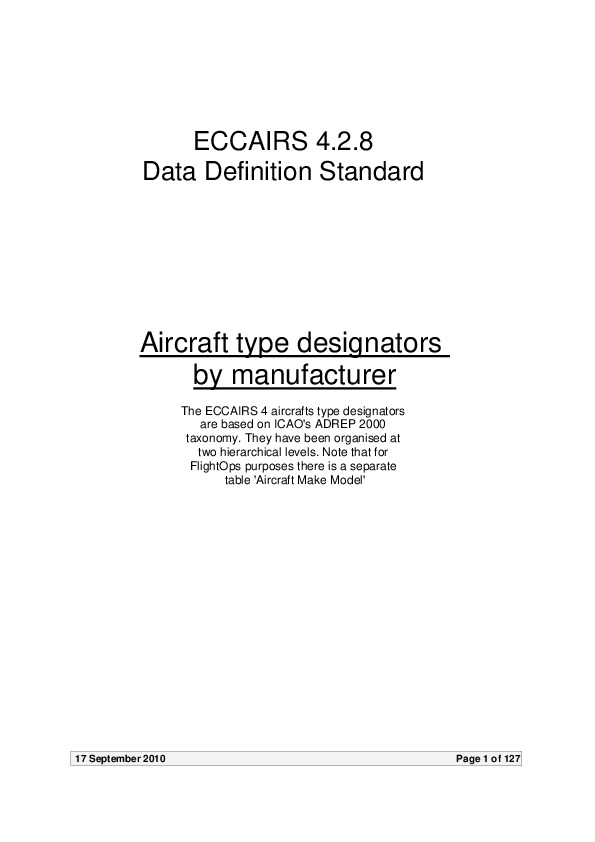 The ECCAIRS 4 aircrafts type designators are based on ICAO's ADREP 2000 taxonomy. They have been organised at two hierarchical levels. Note that for FlightOps purposes there is a separate table 'Aircraft Make Model'