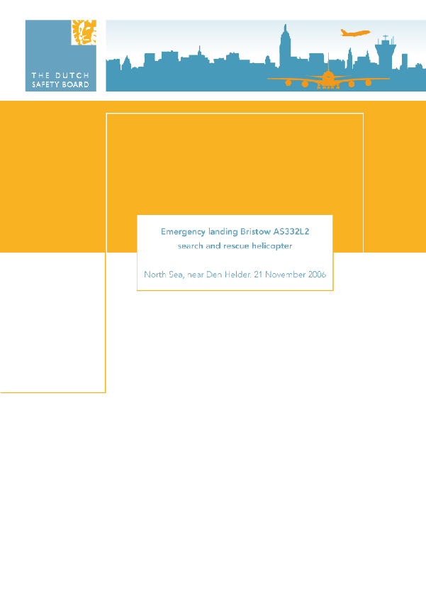 On 21 November 2006, the crew of a Bristow Eurocopter AS332 L2 making an unscheduled passenger flight from an offshore platform to Den Helder in night VMC decided to ditch their aircraft after apparent malfunction of an engine and the flight controls were perceived as rendering it unable to safely complete the flight. All 17 occupants survived but the evacuation was disorganised and both oversight of the operation by and the actions of the crew were considered to have been inappropriate in various respects. Despite extensive investigation, no technical fault which would have rendered it unflyable could be confirmed.