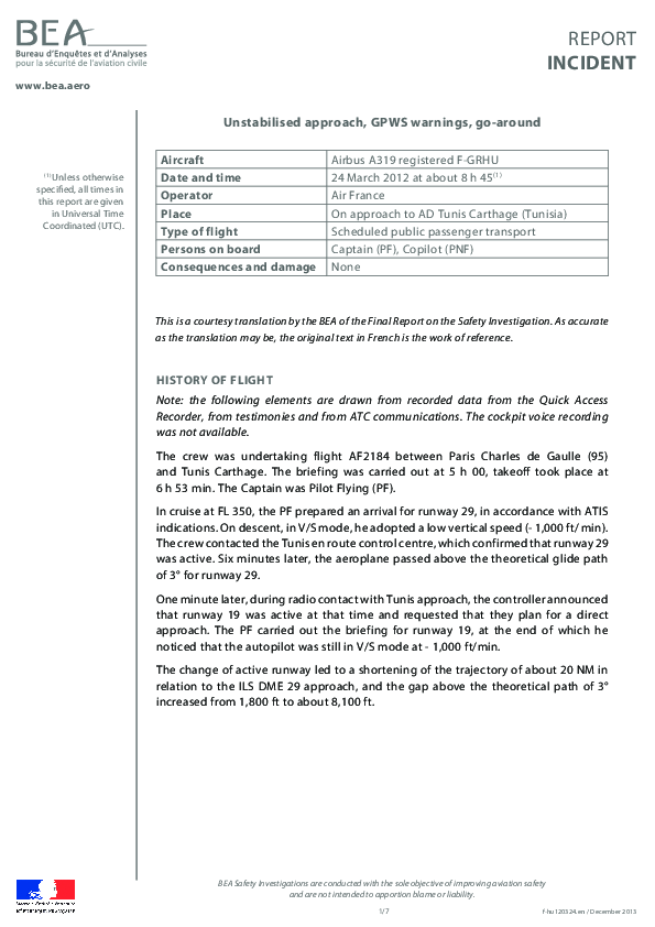 (English) Incident Report: A319, Unstabilised approach, GPWS warnings, go-around, Tunis, 24 Mar 2012