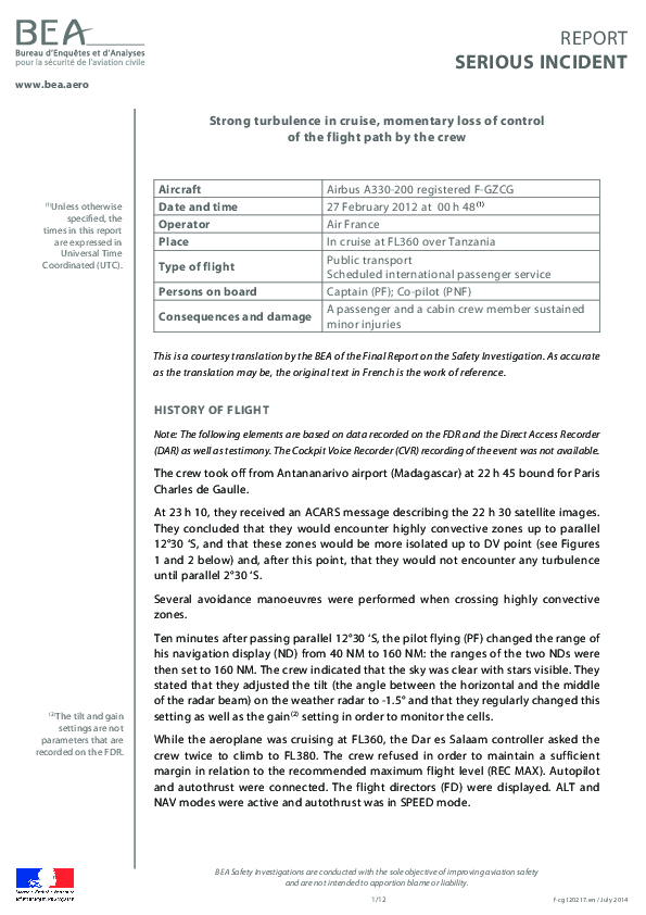 On 27 February 2012, an Air France Airbus A330 en route at night at FL360 and crossing the East African coast northbound at FL360 encountered sudden violent turbulence unanticipated by the flight crew and control of the aircraft was briefly lost with two minor injuries to occupants. The Investigation concluded that a rapidly developing and isolated convective cell had not been detected because of failure to make proper use of the weather radar, but noted that the actions of the crew to recover control had been appropriate and that the aircraft had remained during its flight envelope throughout.