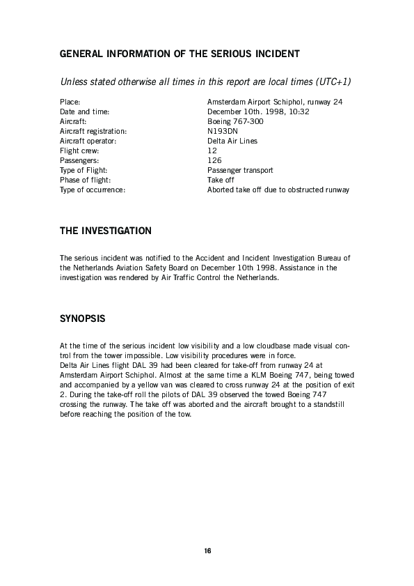 On 10 December 1998, the crew of a Delta airlines Boeing 767-300, which had been cleared for take-off on Rwy 24 at Amsterdam Schiphol Airport, in low visibility conditions, observed a Boeing 747 being towed across the runway ahead of them. The take off was aborted and the aircraft brought to a halt before reaching the B747 which had also been cleared to cross the same runway.