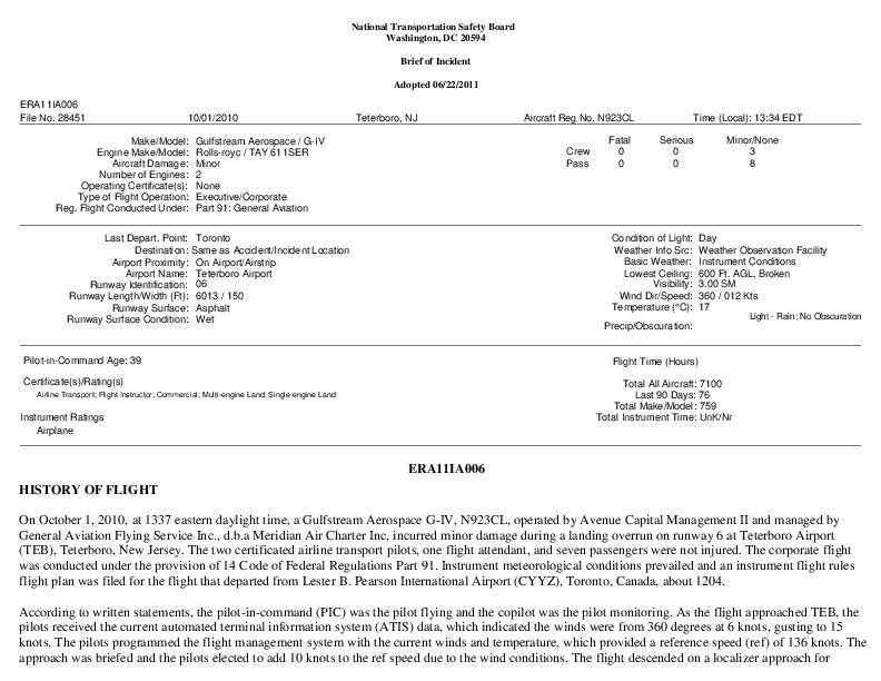On 1 October 2010, a Gulfstream G-IV being operated by General Aviation Flying Service as ‘Meridian Air Charter’ on a corporate flight from Toronto International to Teterboro’ made a deep landing on1833m-long runway 06 at destination in normal day visibility and overran the end of the runway at a speed of 40 to 50 knots before coming to a stop 30m into a 122m long EMAS installation. The aircraft suffered only minor damage and none of the 10 occupants were injured.
