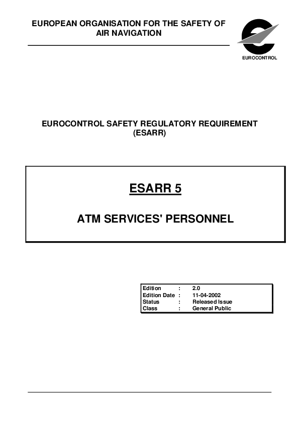 This document sets out the general safety regulatory requirements for all ATM services‚ personnel responsible for safety related tasks within the provision of ATM services across the ECAC area, the safety regulatory requirements for air traffic controllers and the safety regulatory requirements for engineering and technical personnel undertaking operational safety related tasks. Since ICAO Annex 1, Personnel Licensing, was first published, there has been a significant increase in the volume of air traffic throughout the ECAC area. Although Annex 1 has been amended during this period, the basic licensing procedures, including the ratings, have remained unchanged. The increase in traffic, together with new technology, has led to more complex ATC procedures which, in turn, require controllers to become more specialised and to use more advanced controlling techniques. In addition, an inclusion has been developed to detail the safety regulatory requirements for engineering and technical personnel undertaking operational safety related tasks. It is to be noted that, no provisions are foreseen in ICAO SARPS in respect of the mentioned category of ATM personnel and ESARR 5 is the first safety regulatory document to ensure that competency of technical and engineering staff is adequately and formally covered in a harmonised way at European wide level.