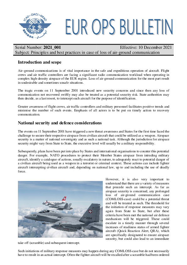 The purpose of the European Operations Bulletin 2021 is to promulgate principles and best practices in case of loss of air-ground communication. It aims to raise awareness amongst aircraft operators, flight crews, air traffic controllers and military stakeholders with a special emphasis on the recovery of communication as well as the required timely actions by all involved entities