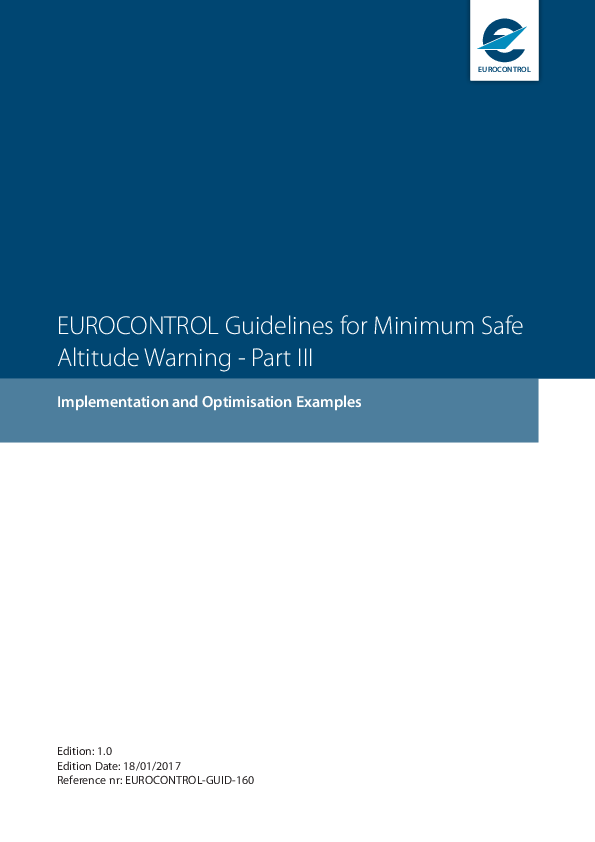These Guidelines specify the minimum requirements and provide comprehensive guidance for the definition, implementation, optimisation and operation of Minimum Safe Altitude Warning (MSAW). Part I describes the MSAW concept of operations as well as the specific requirements on MSAW. Part II contains overall guidance for the complete lifecycle of MSAW. Part III, this document, specifies a generic example of an MSAW implementation as well as detailed technical guidance for optimisation of MSAW.