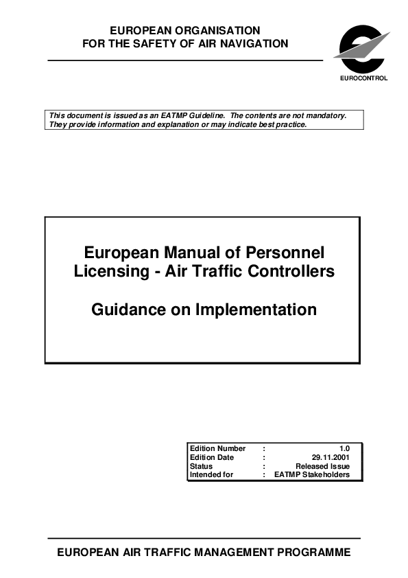 European Manual of Personnel Licensing - Air Traffic Controllers: Guidance on Implementation. This document is intended to assist those Air Traffic Control (ATC) Service Provision or Regulatory Administrations who have decided to implement the provisions of the 'European Manual of Personnel Licensing - Air Traffic Controllers' (EATMP, 2000a) in order to fulfil the requirements of the EUROCONTROL Safety Regulatory Requirement - ATM Services' Personnel (ESARR5) with regard to air traffic controllers (SRC, 2000).