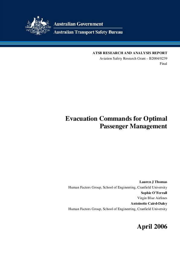 Describes a two-phase research program. Phase I investigated current practice in managing passengers in emergency situations. Phase II comprised a series of experimental evacuation trials.