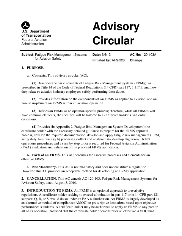 FAA AC 120-103A: Fatigue Risk Management Systems for Aviation Safety