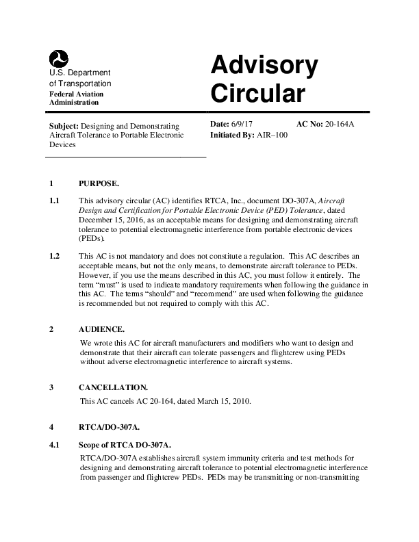 This advisory circular (AC) identifies RTCA, Inc., document DO-307A, Aircraft Design and Certification for Portable Electronic Device (PED) Tolerance, dated December 15, 2016, as an acceptable means for designing and demonstrating aircraft tolerance to potential electromagnetic interference from portable electronic devices (PEDs). This AC cancels AC 20-164, dated March 15, 2010.
