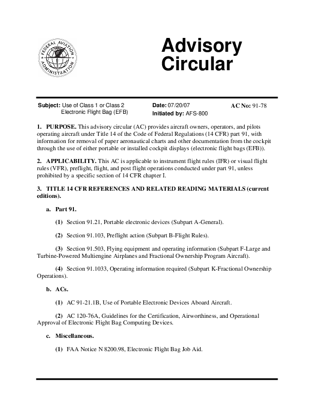 FAA - Advisory Circular 91-78: Use of Class 1/2 EFBs
