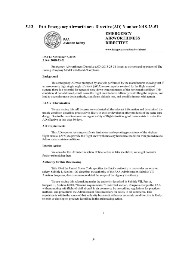 Emergency AD 2018-23-51 in respect of all Boeing 737-8 MAX and 737-9 MAX aircraft on 7 November 2018 which required, within 3 days of receipt, revisions to the certificate limitations and operating procedures contained in the AFM to provide flight crews with runaway horizontal stabiliser trim procedures to follow under certain conditions.
