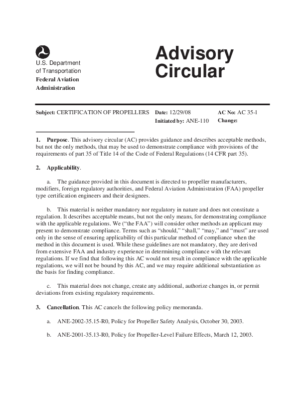 The FAA has developed this policy to provide guidance for conducting a propeller safety analysis. Although part 35 of Title 14 of the Code of Federal Regulations (14 CFR part 35) does not explicitly require a safety analysis, safety analyses are frequently conducted to support the following: a. Section 35.15, Design features. b. Section 35.21, Reversible propellers. c. Section 35.23, Pitch control and indication. d. Section 21.16, Special conditions. e. Aircraft manufacturer certification requirements.