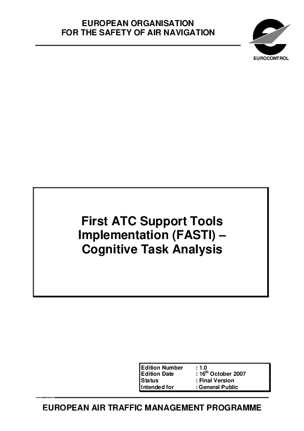 This document presents a Cognitive Task Analysis (CTA) for First Air Traffic Control Support Tools Implementation (FASTI). This CTA describes how ATC tasks will change following the implementation of FASTI tools (i.e., MTCD, MONA and SYSCO) and identifies the mental demands associated with these tasks. Based on the CTA, the report identifies the Human Performance benefits and issues associated with FASTI, and makes recommendations to address these issues. These recommendations refer to training, the human machine interface, working methods, and allocation of tasks/functions. The CTA will be of value to project teams involved in the implementation of FASTI-like support tools, in particlar to Human Factors experts and training experts.