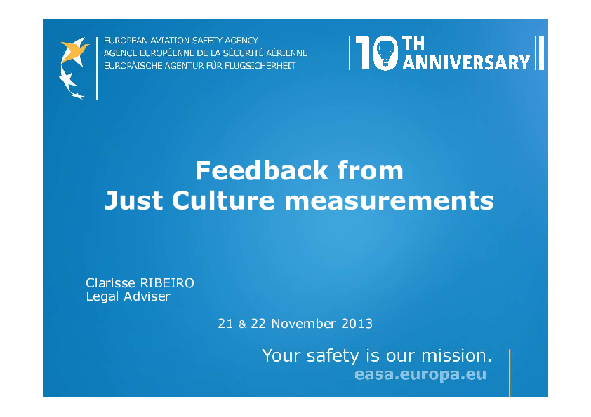 This presentation summarizes the legal basis for Just Culture measurement, the role of EASA in the measurement of Just Culture and also contains a verification exercise for Just Culture SKPI (Safety Key Performance Indicator).
