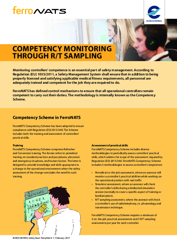 EUROCONTROL Safety Team Pamphlet # 1 / February 2017 Monitoring controllers competence is an essential part of safety management. According to Regulation (EU) 1035/2011, a Safety Management System shall ensure that in addition to being properly licensed and satisfying applicable medical fitness requirements, all personnel are adequately trained and competent for the job they are required to do. FerroNATS has defined control mechanisms to ensure that all operational controllers remain competent to carry out their duties. The methodology is internally known as the Competency Scheme.