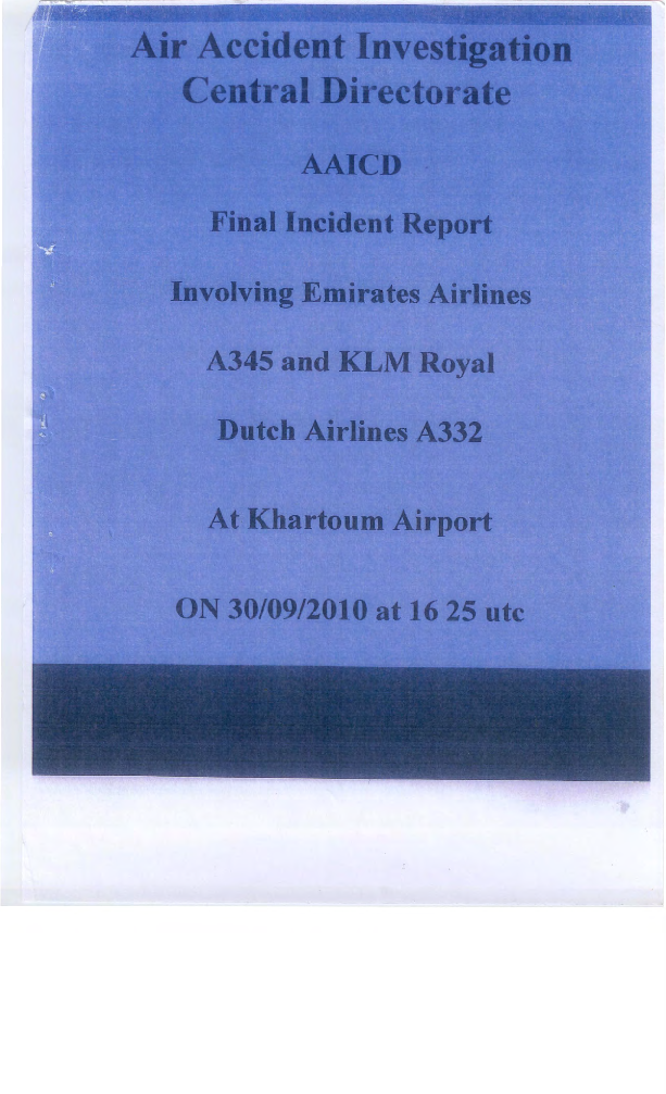 On 30 September 2010, an Airbus 330-200 being operated by KLM on a passenger fight from Khartoum to Abu Dhabi UAE taxied for departure along the main taxiway parallel to the runway in normal night ground visibility and when passing behind a parked Airbus A340-500 with passengers on board hit the lower empennage of that aircraft with its left wing tip without awareness of any impact. When the A340 crew reported the impact a few minutes later after detecting an abnormal jolt and losing the APU function and the services it was providing, the A330 had just been given take off clearance and was about to roll. Signalling from a hand held flashlight and the radio call from the A340 resulted in the A330 holding position and shutting down for a tow back to the Terminal. None of the 142 occupants on the A330 or any of those on the A340 were injured.