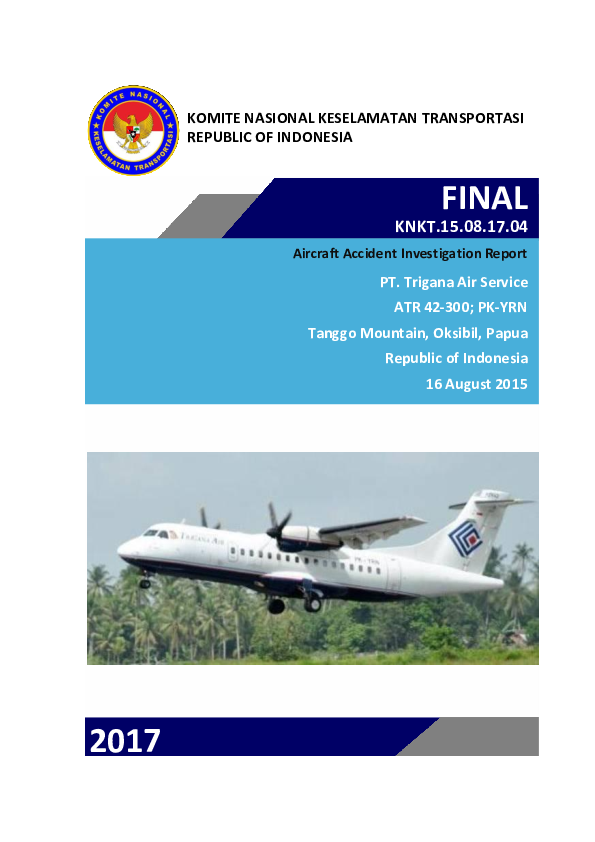 Final KNKT.15.08.17.04: AT43 (PK-YRN) CFIT vicinity Oksibil Papua Indonesia, 16 Aug 2015