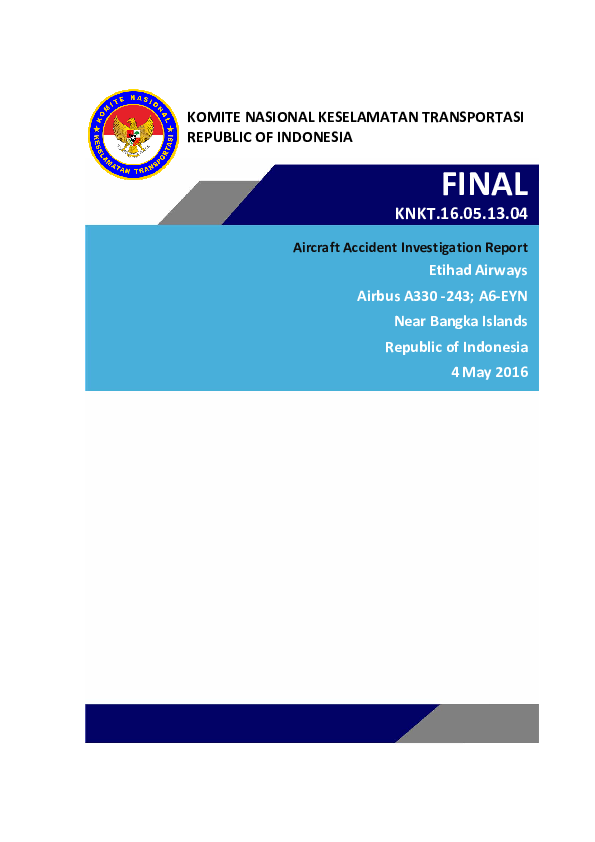 Final KNKT.16.05.13.04: A332 CAT en route near Bangka Island Indonesia, 4 May 2016