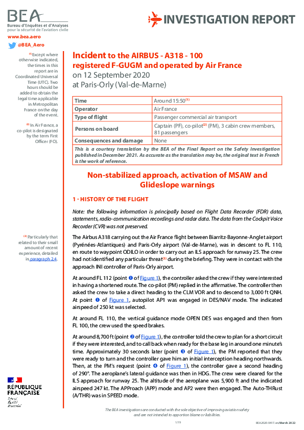 Final Report A318 (F-GUGM), vicinity Paris Orly France, 12 September 2020