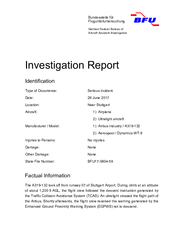 Final Report A319 (D-AGWB) / WT9, vicinity Stuttgart Germany, 26 June 2017