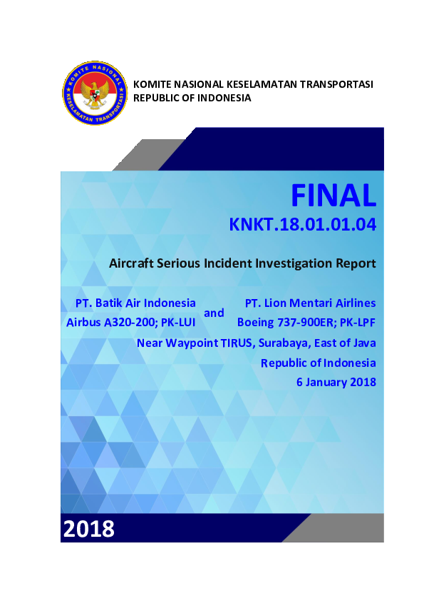 Final Report A320 (PK-LUI) & B739 (PK-LPF), en-route NW of Surabaya Indonesia, 6 Jan 2018