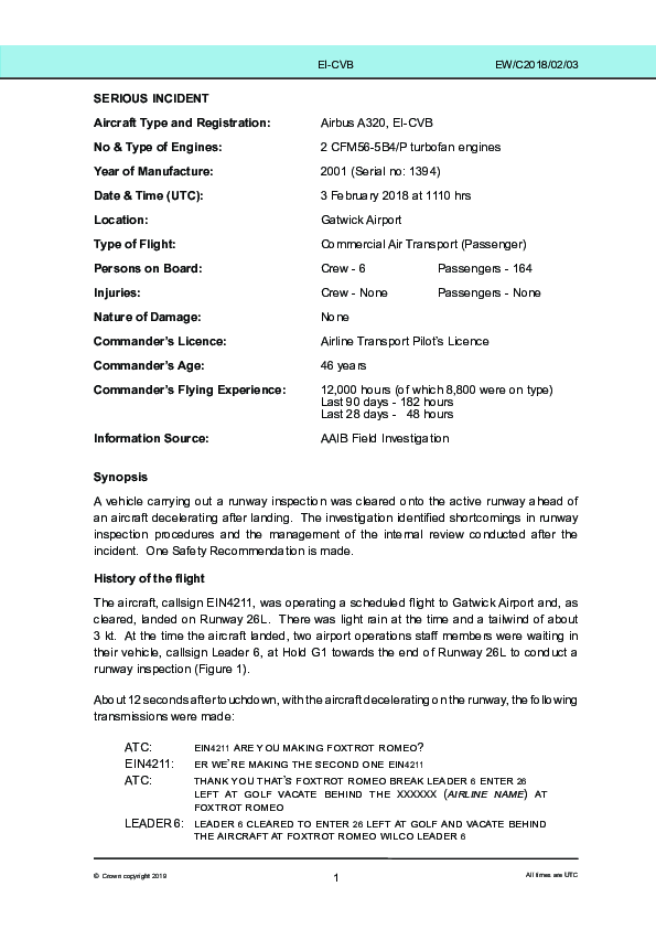On 3 February 2018, a runway inspection vehicle was cleared onto the active runway at London Gatwick ahead of an aircraft which had just touched down and driven towards it having been cleared to do so because the aircraft crew's confirmation that they would clear the runway before reaching the vehicle was considered by the controller as a clearance limit. The Investigation found that the associated runway inspection procedure had not been adequately risk-assessed and noted that many issues raised by it had still not been addressed by the time it was completed eighteen months later.