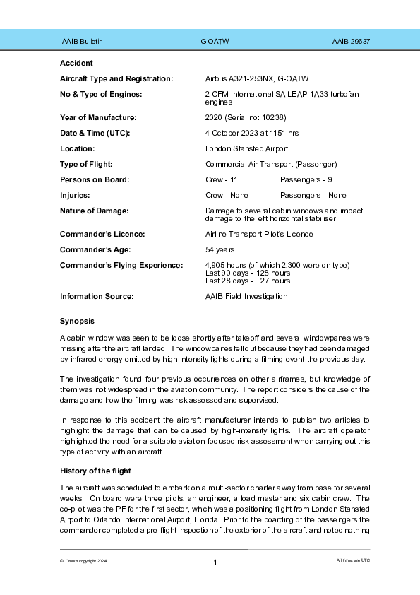 On 4 October 2023, an Airbus A321 climbing out of London Stansted with the eighteen occupants all seated towards the front of the passenger cabin was discovered to have several missing or damaged windowpanes on the left side towards the rear. The aircraft returned to land where damage was also found to one of the horizontal stabilisers. The window panes fell out because of damage by infrared energy emitted from high-intensity lights during a filming event the previous day. Four previous similar events were identified but it was found that knowledge of them was not widespread in the aviation community.