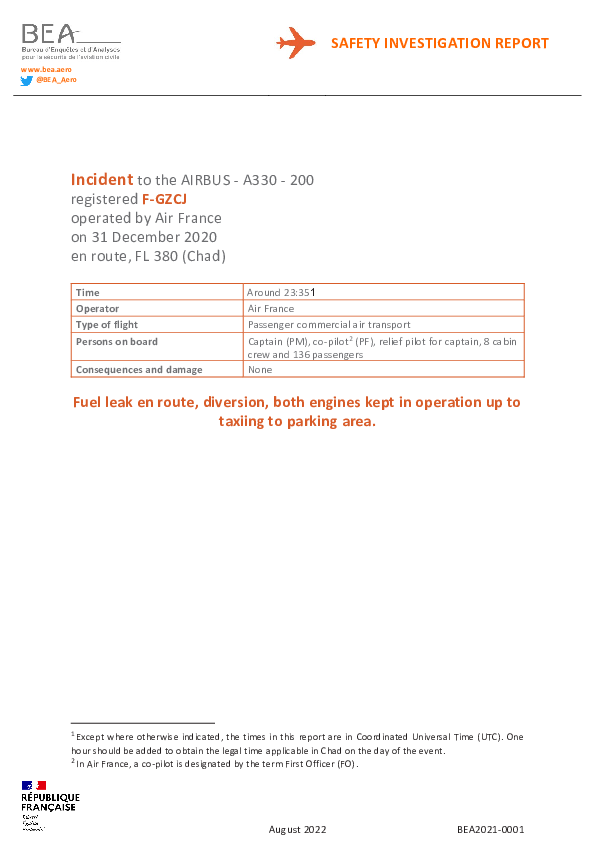 On 31 December 2020, an Airbus A330-200 identified a fuel leak during a routine top-of-climb check but instead of following the prescribed engine shutdown and leak isolation procedure and then landing as soon as possible, the crew had continued on track until diverting to N’Djaména over 90 minutes later by which time nearly six tonnes of fuel was missing. The leak was caused by an incorrectly assembled connection at the pylon/engine interface. The flight crew’s significant procedural non-compliance was identified as having introduced an avoidable fire risk and been indicative of a systemically weak safety culture at the airline concerned.