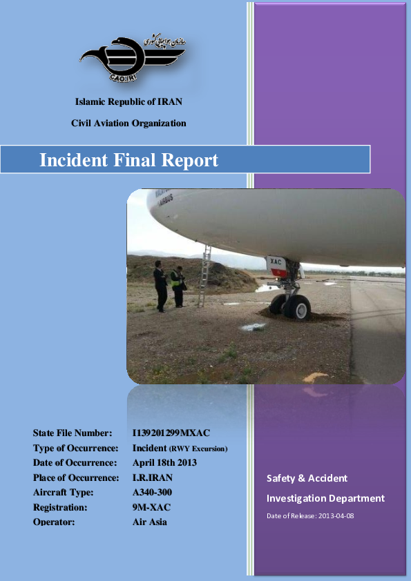 On 18 April 2013, an Airbus A340-300 was unintentionally taxied off the side of the runway during a 180° turn after backtracking the departure runway at Tabriz at night. The Investigation found that the prevailing wet runway conditions meant that the runway width alone was insufficient for the turn and full advantage had not been taken of a wide taxiway at the runway displaced threshold. It was also found that the technique used to turn had not been optimum and that the runway involved was for daylight use only and had a strength rating not compatible with A340 use.