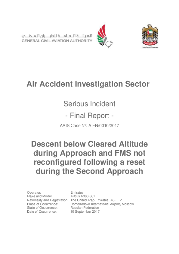 On 10 September 2017, an Airbus A380-800 cleared for an ILS approach at Moscow Domodedovo in visual daylight conditions descended below its cleared altitude and reached 395 feet agl whilst still 7nm from the landing runway threshold with a resultant EGPWS ‘PULL UP’ warning. Recovery was followed by an inadequately prepared second approach which was discontinued and then a third approach to a landing. The Investigation attributed the crew’s difficulties primarily to failure to follow various routine operating procedures relating to use of automation but noted that there had been scope for better presentation of some of these procedures.